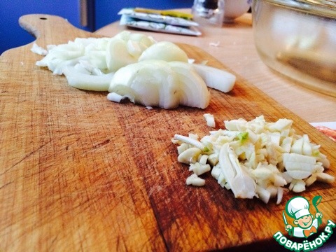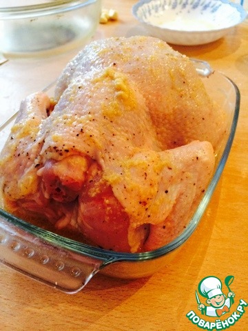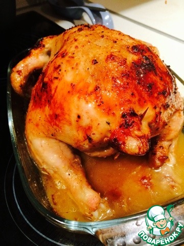 Курицу начинить луком и чесноком. Отверстие скрепить зубочисткой. Полить соусом сверху. Поместить в предварительно разогретую до 190 С духовку на 1 час. Периодически поливать жидкостью от жаренья.