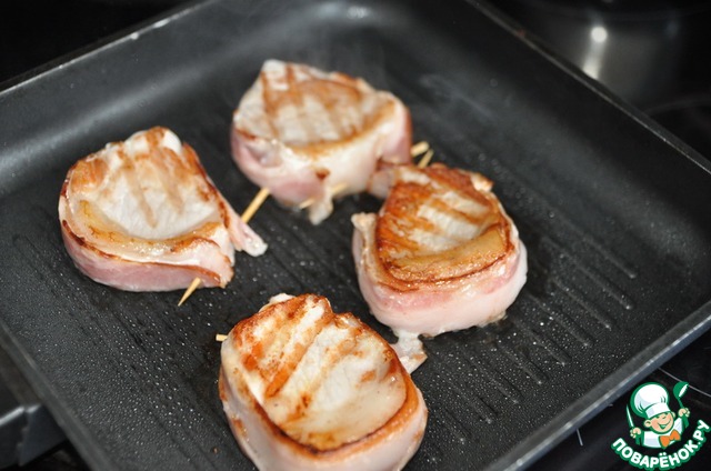 Каждый кусочек мяса оборачиваем в полоску бекона. Так как толщина бекона в 2 раза больше толщины "медальона", то бекон перегнула пополам. Скрепляем с помощью зубочистки концы, чтобы бекон плотно прилегал к мясу. Кладём "медальоны" на нагретую сковороду-гриль.