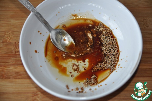 Готовим заправку. Смешиваем растительное и кунжутное масло, соевый и устричный соус, добавляем мёд, семена кориандра, имбирь. Соль по необходимости и желанию.