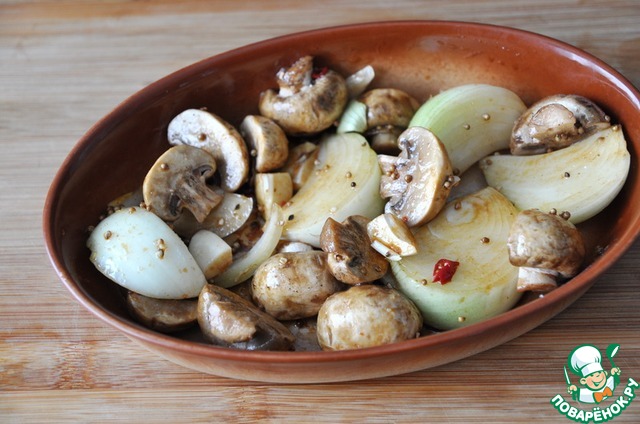 Перемешиваем лук, чеснок и грибы с заправкой, кладём в форму для запекания.