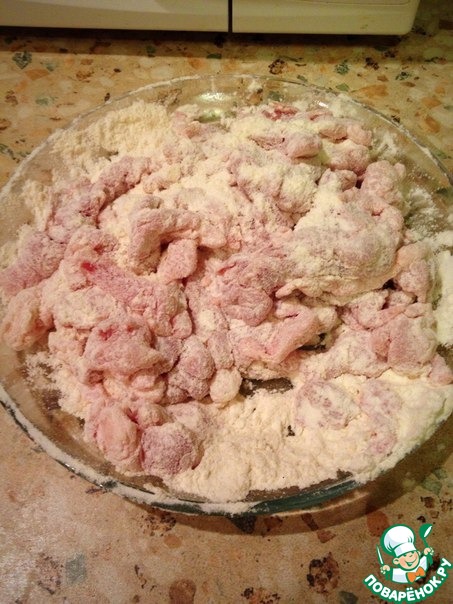 Мясо очищаем от пленок, режем поперек волокон на куски толщиной 1 см и слегка отбиваем. Из этих кусков нарезаем полоски до 1см. толщиной. Мясо панируем в муке, но потом его помещаем в дуршлаг или в сито и встряхиваем, чтобы удалить лишнюю муку.