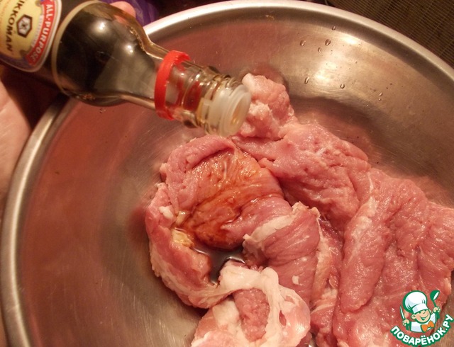 Полить мясо 3-мя ложками соевого соуса Киккоман и поперчить. Можно добавить любимые специи. Оставить мариновать минимум на час, а можно и дольше.