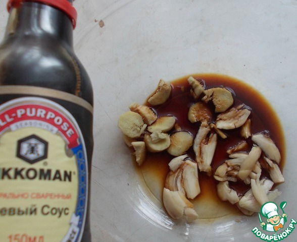 Чеснок раздавить с помощью ножа и смешать с соевым соусом Киккоман и соком лимона.