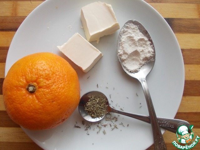 Приготовить масло, тимьян, мандарин и муку. Две сковороды. В одну влить растительное масло. Поставить на огонь.