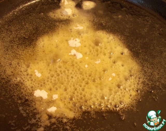 Отдельно на сковороде растапливаем масло. Добавляем муку и помешивая доводим ее до слегка золотистого цвета.