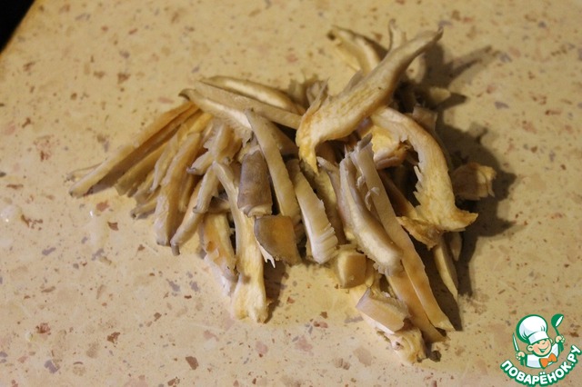 Грибы вешенки, вымыть, обсушить и нарезать тонкой соломкой.