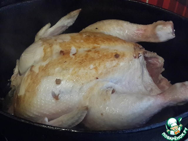 В гусятнице/утятнице/ жаровне растопите сливочное масло, раскалите его. Поместите курицу в жаровню целиком и обжарьте её со всех сторон до слегка золотистой корочки