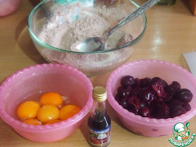 Желтки отделить от белков. Смешать муку, просеянный через ситечко какао-порошок и разрыхлитель теста. Замороженную вишню без косточек разморозить. Если вы используете вишни из компота, то нужно из них вынуть косточки и откинуть на сито.
