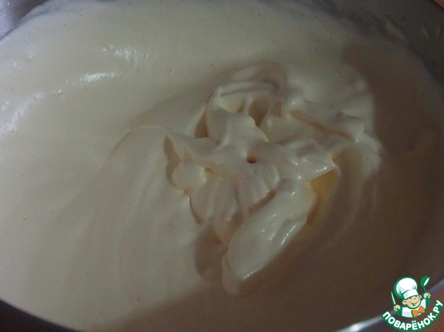 Белки взбить со щепоткой соли до тугих пиков, постепенно добавляя сахар. Затем, продолжая взбивать, по одному добавлять желтки. Получается вот такая густая масса.