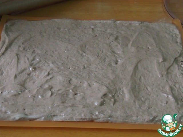 В яичную массу осторожно добавить смесь муки и какао, перемешать лопаткой. Противень (у меня 30Х40 см) застелить бумагой для выпечки, вылить тесто, разровнять и поставить печь в горячую духовку на 12-15 минут при температуре 180 градусов.