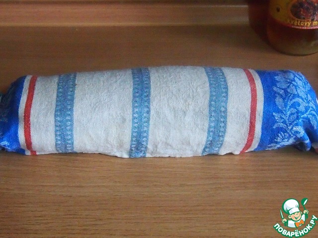 Завернуть бисквит рулетом вместе с полотенцем и оставить остывать, не нужно оставлять его в полотенце слишком долго, чтобы не отсырел.