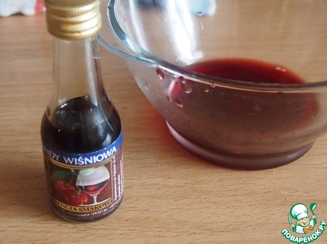 В сок от размороженной вишни добавить вишневый ликер (наливку, ром, коньяк - что есть в доме), общий объем примерно 80 мл. В ингредиентах указано 80 мл самого ликера, но все зависит от вас, будете ли вы использовать только ликер или разведете его с соком или с компотом. Если готовите для детей, алкоголь можно вообще исключить, оставить только сок или компот.