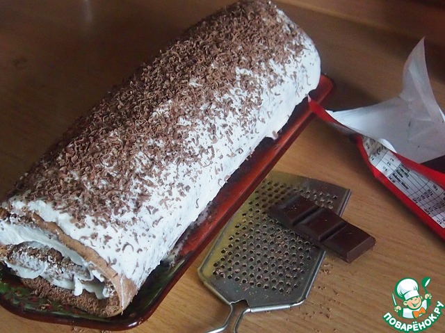 С помощью полотенца свернуть рулет, помазать его сверху остатками сливок, а сверху натереть на мелкой терке шоколад. Если имеются засахаренные вишни, украсить ими рулет. Поставить рулет в холодильник на часик-два, чтобы он хорошенько остыл.