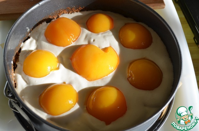 Сверху выкладываем половинки персиков и отправляем в холодильник примерно на 30 минут.
