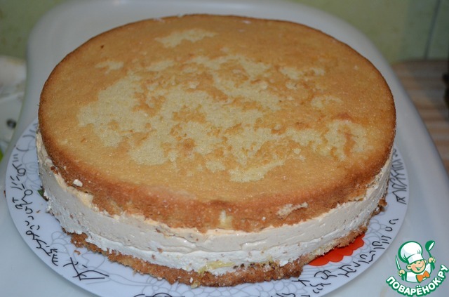 Вынимает торт из холодильника. Выкладываем творожный слой с курагой и верхний бисквитный корж. Немного его прижимаем, чтобы крем зашел в поры бисквита и торт лучше "схватился". Снова ставим торт в холодильник. Только в этот раз - на 2-3 часа, до полного застывания.