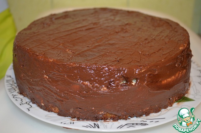 Покрываем торт сверху и по бокам тонким слоем шоколадного ганаша. После этого можно охладить торт еще коло 30 минут.