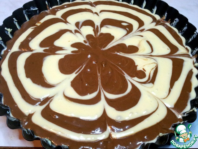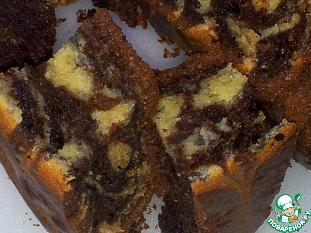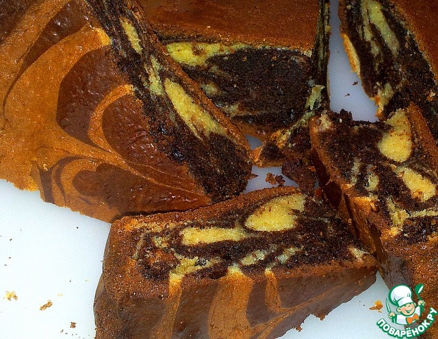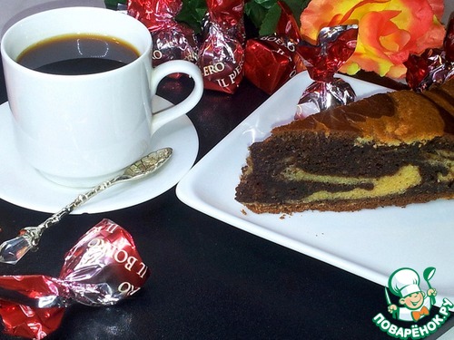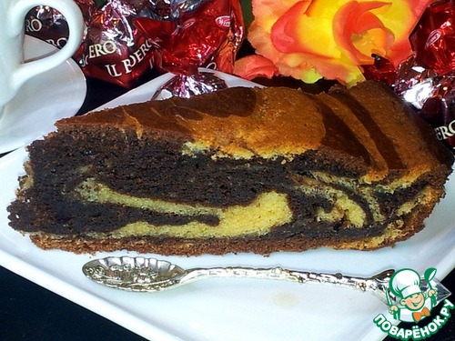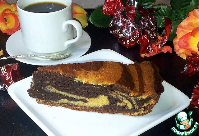 | Пирог я сделала по мотивам уже имеющегося рецепта "Зебра". Пропорции другие. Добавила белый шоколад и какао заменила тёмным шоколадом. Пирог рыхлый с натуральным вкусом шоколада. Не добавляла ароматизаторов. |