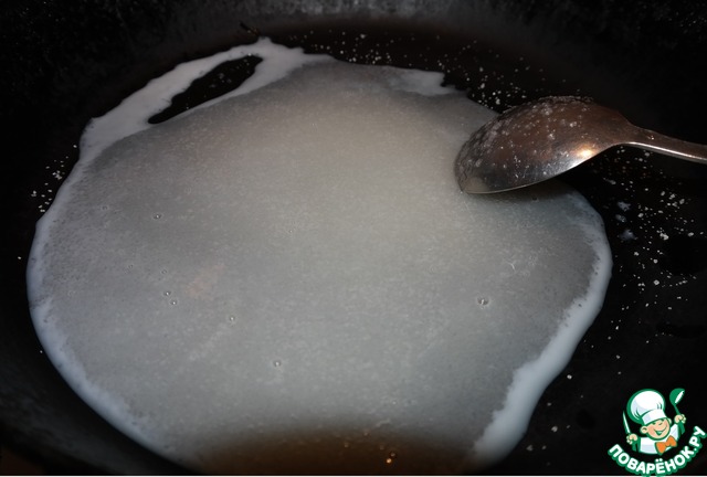 1. На сковороде ( чтоб не подгорело) смешиваем 8ст. л. сахара и 2 ст. л. молока.