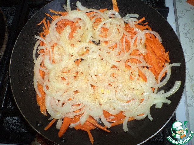 Обжарив морковь, добавляем нарезанный лук полукольцами.