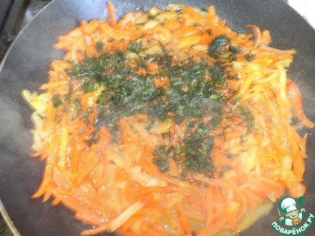 Тушим 15 минут, добовляем зелень (у меня замороженный укроп).
