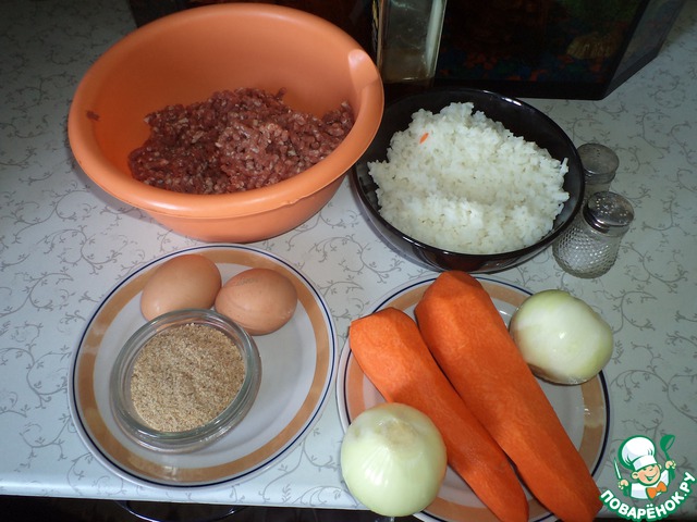 Для приготовления нам понадобится pис отварной, Фарш мясной, морковь, Лук репчатый, яйца, сухари, орехи, масло сливочное, растительное оливковое, соль, перец.
