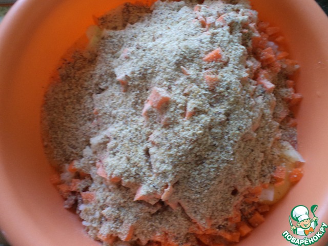 Добавить панировoчные сухари и орехи (я размолола в блендере, можно и ножом). Добавляем соль, перец по вкусу.