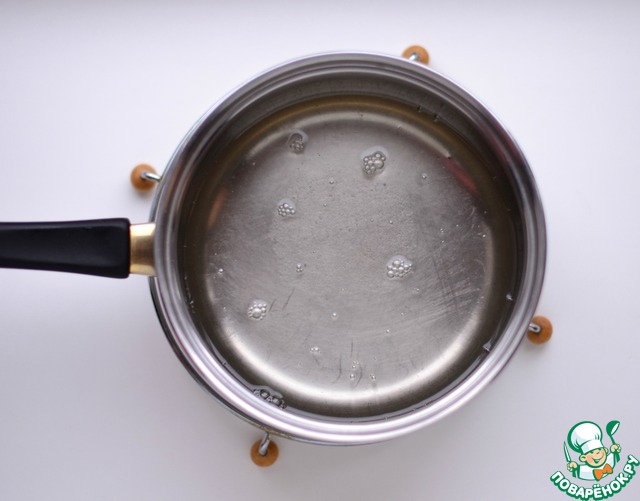 - В кастрюльку налить 120 мл воды, добавить сахар. Довести жидкость до кипения, чтобы сахар растворился.
