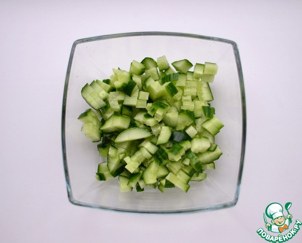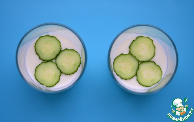 - Выложить огуречные слайсы на йогуртовое желе, слегка вдавив их. Снова поставить в холодильник на 15 мин.