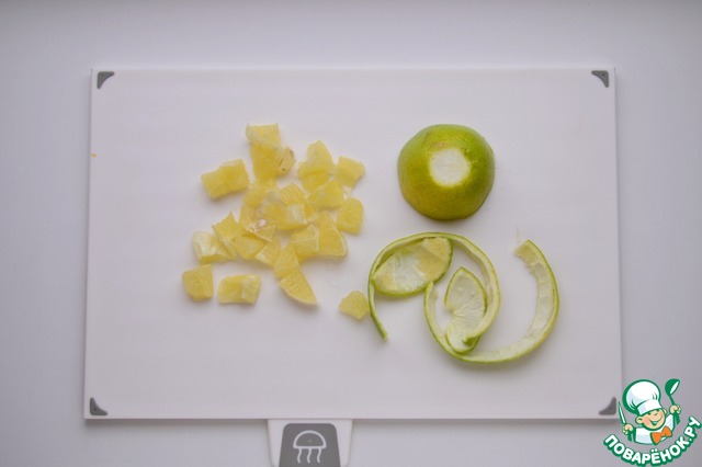 - Из половины лайма выжать сок, второй порезать на кубики (кожуру предварительно снять).
