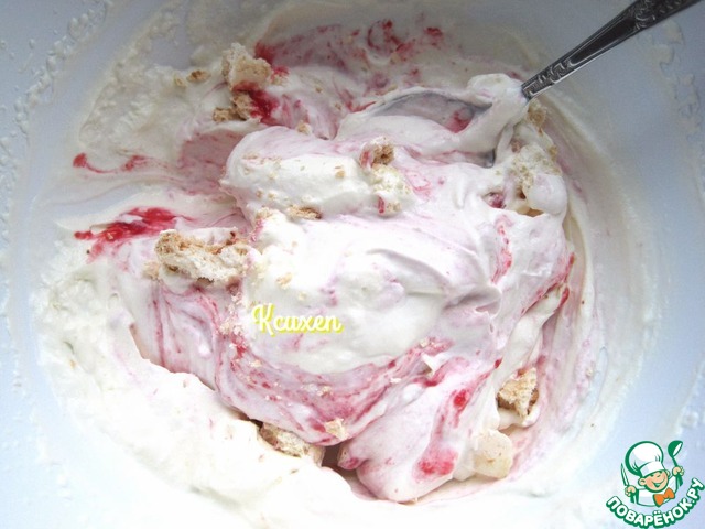 В сливки добавляем немного малинового пюре и слегка перемешиваем ложкой так, что бы крем не превратился в однородную массу. Малина в креме должна оставаться "прожилками". Не обязательно использовать всё малиновое пюре, консистенция крема не должна стать текучей, крем по прежнему должен держать объём. 3 палочки-безе крупно раскрошим руками и немного крошек вмешаем в крем.