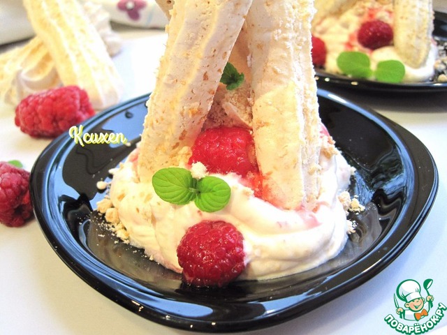 | Нежный и воздушный, похожий на облачко, десерт.. Лёгкие и хрустящие кокосовые палочки-безе прекрасно сочетаются с нежностью сливочно-малинового крема! |