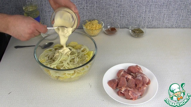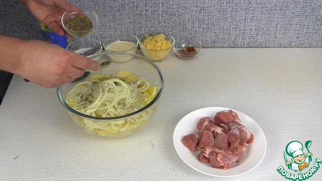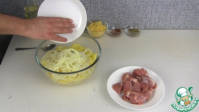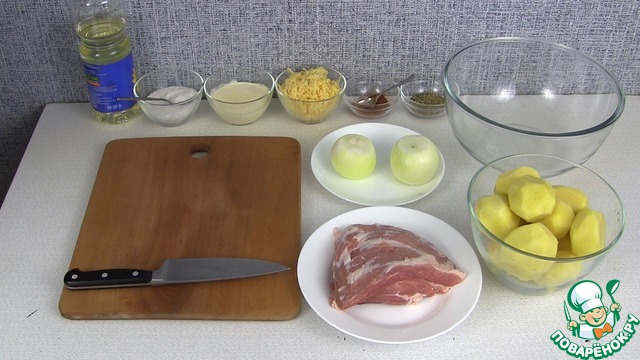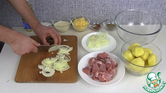 картофель, мясо, лук, сливки, сыр, специи, соль и немного растительного масла.