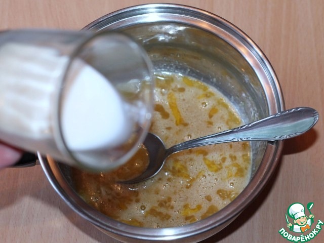 Влить в массу молоко, тщательно все перемешать, взбить, поставить на плиту, на слабый огонь. Проварить смесь до густоты сметаны, постоянно ее помешивая, дать остыть.