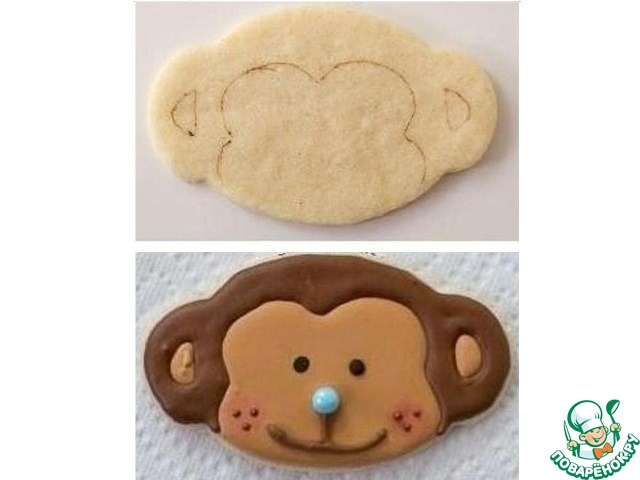 При приготовлении печенья удобнее использовать шаблон – так все печеньки получатся у вас ровнее, одного размера. Нарисуйте от руки на картоне мордочку обезьяны (как на фото), вырежьте шаблон.