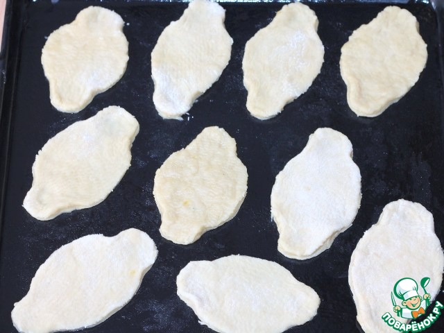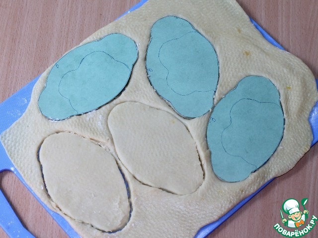 Затем раскатать тесто в пласт толщиной 1 см. С помощью острого ножа вырезать из теста овалы – мордочки. У меня получилось 12 штук, ~ 10-11 см в длину.