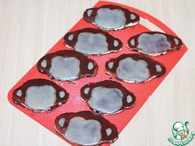 Затем растопим белый шоколад с 1 ст. л. молока и нарисуем на печенье мордочки. Я рисовала тонкой кисточкой. Даем шоколаду остыть в холодильнике.