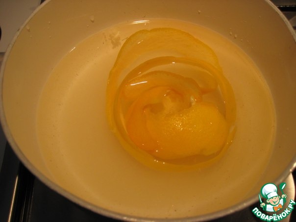 в сотейнике смешать воду с сахаром, довести до кипения и полного растворения сахара, добавить цедру, снять с огня. Остудить до комнатной температуры, цедру выкинуть. Добавить апельсиновый ликер.