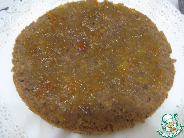 Нижний корж кисточкой пропитать апельсиновым сиропом, смазать тонким слоем джема,