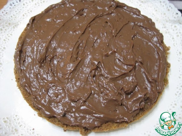 Смазать кремом. Накрыть вторым коржом, повоторить действия, как с первым коржом.