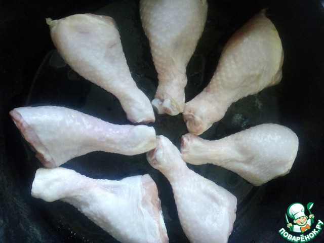 Куринные ножки помыть. Нагреть большую сковородку с маслом на среднем огне и обжарить курицу минут 10
