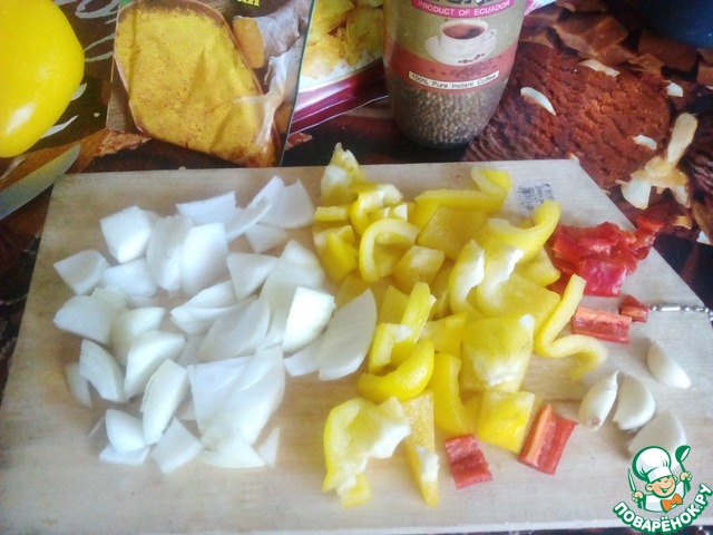 Курочку переложить на блюдо, а лук (1 шт.) и перец болгарский (1шт.) крупно нарезать и обжарить в течение нескольких минут.