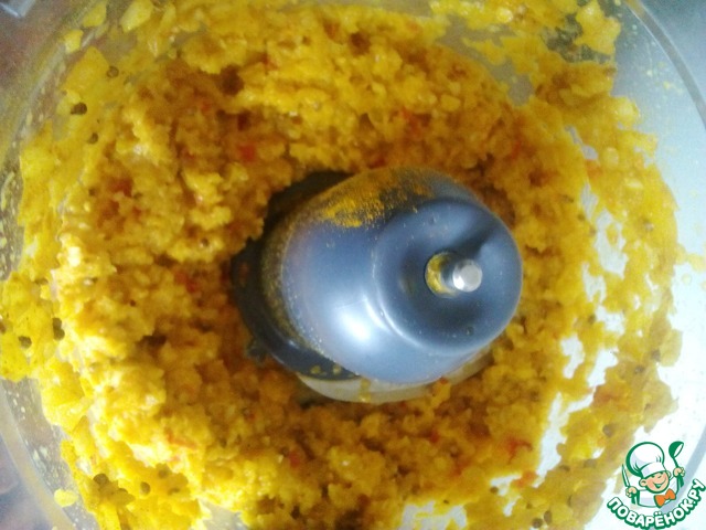 Положить 1 лук, 1 перец, чеснок и перец чилли в кухонный комбайн. Добавить 1 ст. л. масла оливкового.