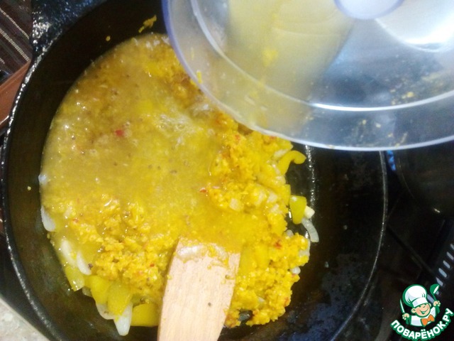 К жаренным овощам добавить пасту, которую мы взмололи и 0,5 л воды. Тушить 5 минут