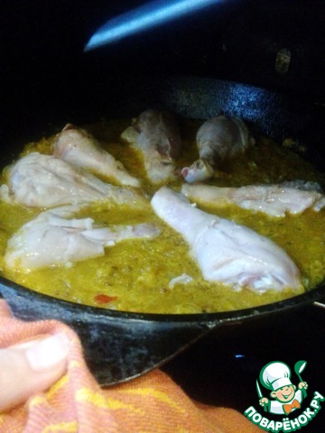 Положить курицу в сковороду и отправить в разогретую духовку 180© на 45 минут.
