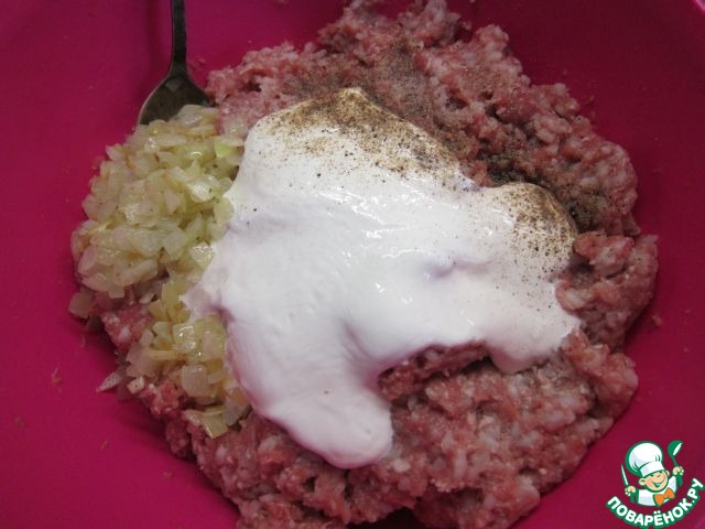 Фарш с рисом+соль+перец+0,5 стак. сметаны+обжаренный лук =