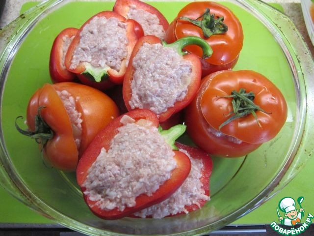 Фаршируем наши овощи, укладываем в жаропрочную посуду.