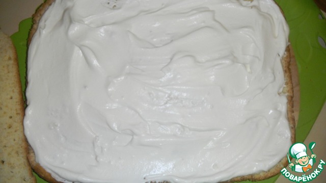 Бисквит вынимаем из духовки, остужаем и разрезаем вдоль на 2 части. На середину и верх торта обильно наносим крем.