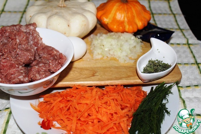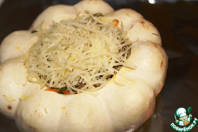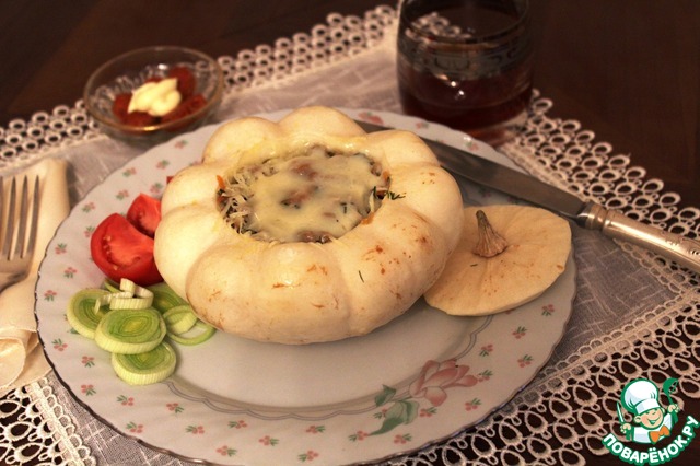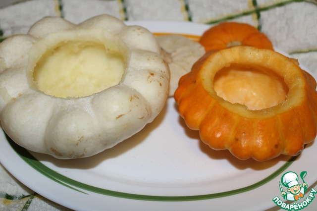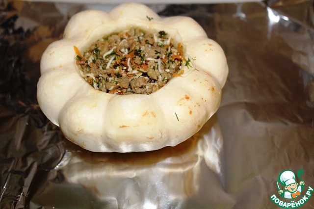 Я готовила из зрелых плодов, поэтому запекла их предварительно в духовке, разогретой до 200 градусов, приблизительно 30 минут. Если патиссоны молодые, время запекания можно сократить до 10 минут или отказаться от предварительного запекания совсем.