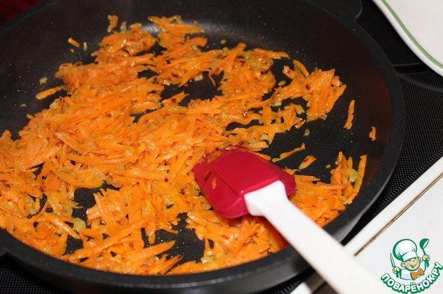 Добавить морковь, натертую на средней терке, и жарить еще 3 - 4 минуты.