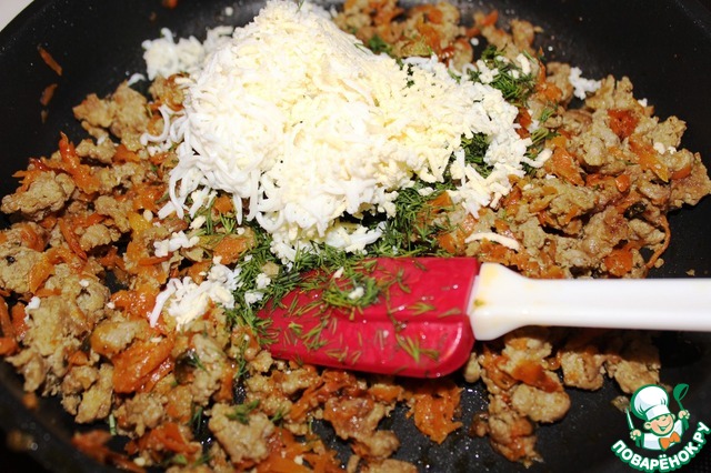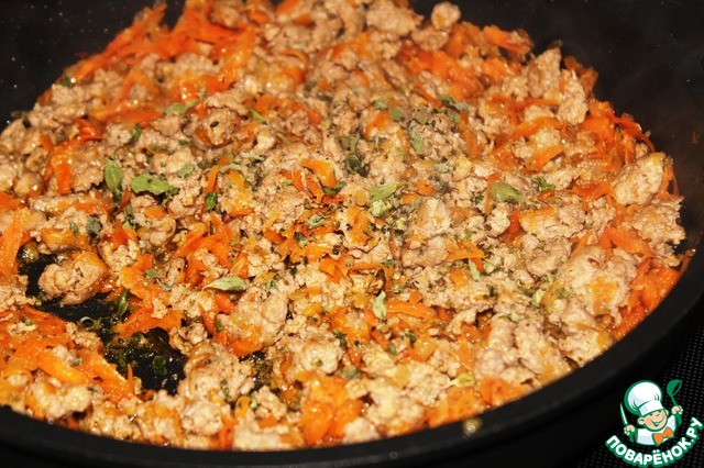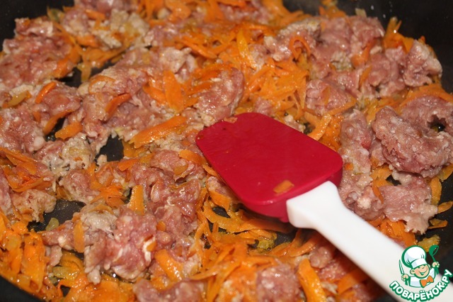 Затем добавить к овощам мясной фарш, посолить и жарить до готовности фарша.